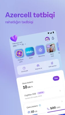 Azercell vám nabízí komplexní správu vašeho mobilního účtu. Snadno kontrolujte zůstatek, prohlížejte historii operací a plateb, objednávejte internetové a roamingové balíčky, měňte tarify a dobíjejte zůstatek digitální peněženkou. Objevte mnoho dalších užitečných funkcí na jednom místě.