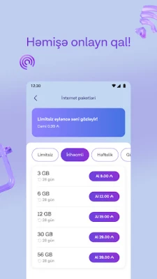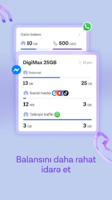 Potřebujete nová data nebo plánujete cestu do zahraničí? S Azercell to zařídíte bez námahy. Jednoduše objednávejte internetové balíčky přesně podle vašich potřeb, spravujte roamingovou linku a aktivujte roamingové balíčky jediným klepnutím. A pokud se vaše požadavky změní, není nic snazšího než aktualizovat nebo změnit váš stávající tarifní balíček. Díky možnosti dobíjet zůstatek pomocí digitální peněženky zůstanete vždy připojeni. Azercell přináší flexibilitu, kterou si zasloužíte.