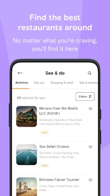 Ať už jste kdekoli, aplikace Experience Abu Dhabi je vždy s vámi. Funkce "Co je poblíž" vám okamžitě ukáže zajímavosti v bezprostřední blízkosti a ikonka "Zaveď mě tam" vás spolehlivě navede k jakékoli destinaci díky integrované a snadno ovladatelné mapě. Inspirujte se bohatými foto a video galeriemi, čtěte integrované recenze z TripAdvisoru pro informovaná rozhodnutí a sdílejte své zážitky s přáteli. Díky push notifikacím budete mít vždy okamžitý přístup k nejnovějším informacím a budete v obraze o všech novinkách v Abú Dhabí.