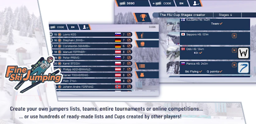 Fine Ski Jumping nabízí širokou škálu herních režimů, které uspokojí každého fanouška. Soutěžte v napínavých Custom Tournaments, probojujte se Světovým pohárem, vyzkoušejte si náročnou Čtyřmostovou šňůru s KO systémem, nebo se utkejte o titul na Mistrovství světa v letech na lyžích. Ať už preferujete individuální výzvy, nebo vedete svůj tým k vítězství, zde najdete své místo. Zapojte se do online arény, kde můžete vytvářet vlastní soutěže, vybírat si můstky, definovat podmínky větru, počet kol a dokonce i délku trvání – překvapte své přátele jedinečnými výzvami. Navíc, s unikátním NÁVRHÁŘEM MŮSTKŮ si můžete navrhnout vlastní skokanské dráhy a hrát je jak offline, tak i s přáteli online.